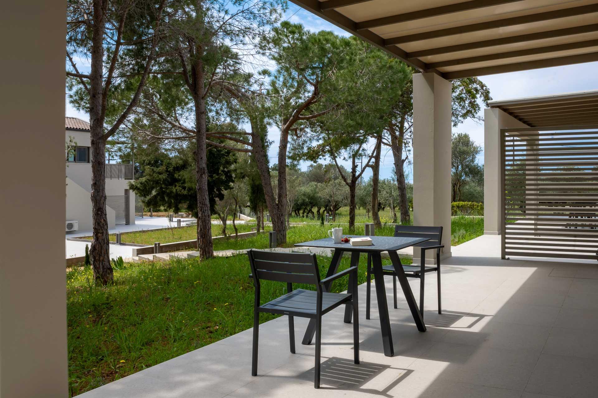 Περπατώντας κάτω από τη σύγχρονη αψίδα για να μπείτε στο συγκρότημα του Ακρωτηρίου, σας εντυπωσιάζει αμέσως η μεγάλη πισίνα που απλώνεται μπροστά σας προς το Ιόνιο Πέλαγος στο βάθος. Ένας φαρδύς διάδρομος χωρίζει τις δύο πρώτες σουίτες εκατέρωθεν σας, καθώς κατεβαίνετε τα σκαλοπάτια με ήπια κλίση προς τη μεγάλη βεράντα και την πισίνα, που περιβάλλεται από άνετες ξαπλώστρες. Στην άλλη άκρη θα βρείτε το τρίτο κτίριο, που στεγάζει τρεις ξεχωριστές σουίτες. Όλο το συγκρότημα περιβάλλεται από ψηλά ώριμα δέντρα, που παρέχουν άφθονη σκιά και παφλασμένη ηλιοφάνεια. Η μεγάλη πισίνα (65 τ.μ.) έχει σύγχρονο ορθογώνιο σχήμα και περιβάλλεται από επίπεδη πλακόστρωτη βεράντα επιπλωμένη με άνετες ξαπλώστρες. Ένα υπαίθριο ντους είναι διαθέσιμο για να ξεπλυθείτε μετά το κολύμπι ή από τις ημέρες στην παραλία!