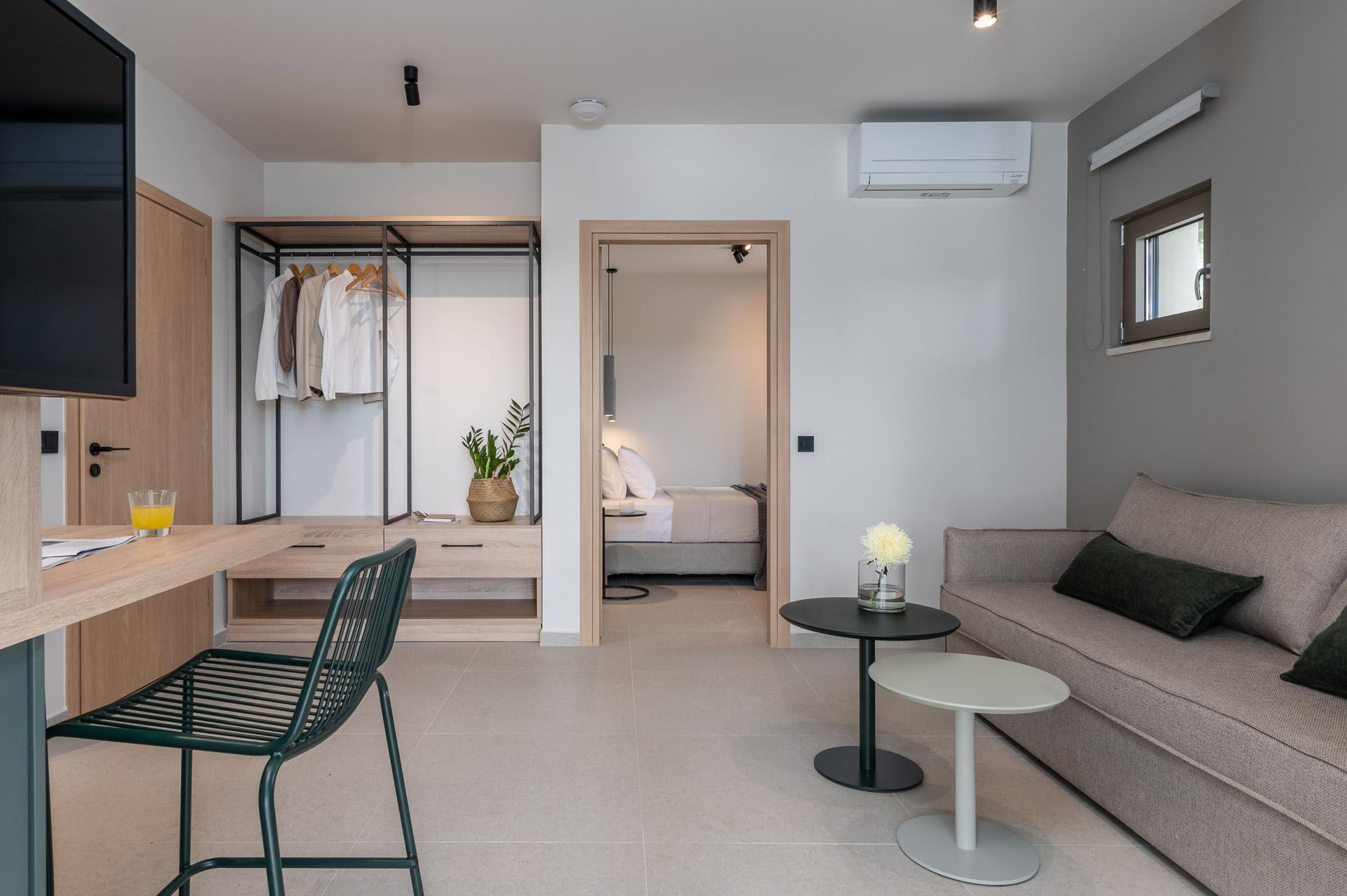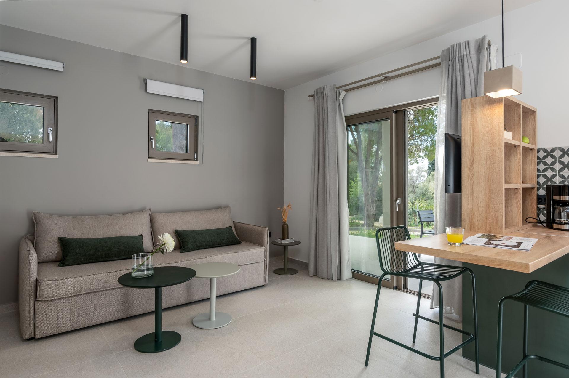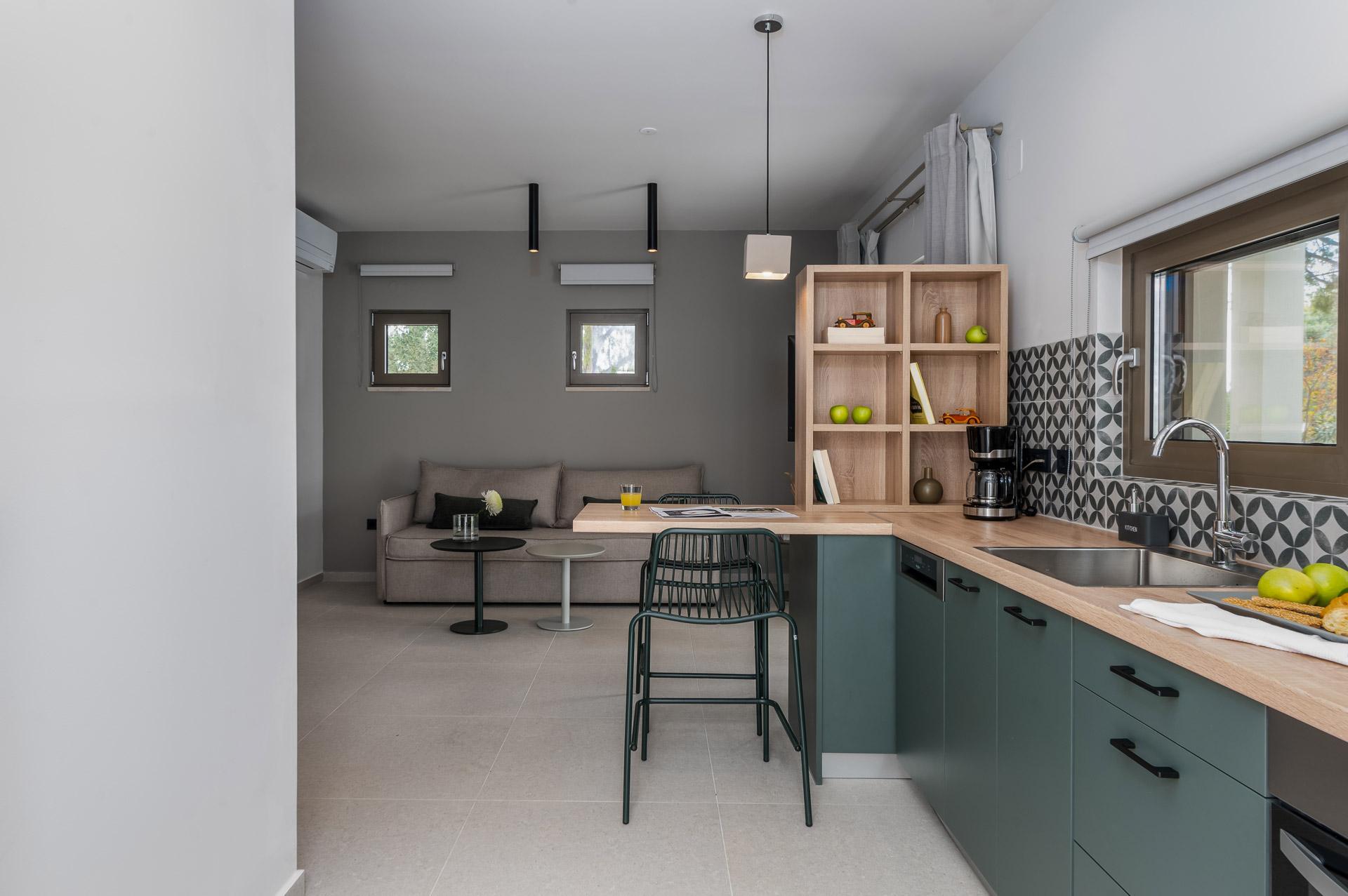 Η Κύματα είναι μια ισόγεια σουίτα 1 υπνοδωματίου, 45 τετραγωνικών μέτρων, που βρίσκεται δίπλα στην είσοδο του καταλύματος. Ένας απλός και καλά σχεδιασμένος χώρος, το Kymata είναι πλήρως προσβάσιμο για επισκέπτες με ειδικές απαιτήσεις προσβασιμότητας ή αναπηρικά αμαξίδια και διαθέτει επιπλέον ένα επικλινές μονοπάτι κατάλληλο για αναπηρικά αμαξίδια για να φτάσετε στη βεράντα της πισίνας. Το ξεχωριστό υπνοδωμάτιο περιέχει ένα queen size κρεβάτι, ενώ ο καναπές στο καθιστικό μπορεί να μετατραπεί σε 2 ενωμένα μονά κρεβάτια για να φιλοξενήσει άλλα 2 άτομα. Υπάρχει ένας καλά εξοπλισμένος χώρος κουζίνας και συρόμενες πόρτες που ανοίγουν σε μια ιδιωτική σκιερή βεράντα για φαγητό και χαλάρωση στον εξωτερικό χώρο. Παρακαλείστε να σημειώσετε: η πισίνα δεν διαθέτει κεκλιμένη είσοδο ή σε αυτό το σημείο προσβάσιμο ανελκυστήρα για χρήστες αναπηρικού αμαξιδίου.