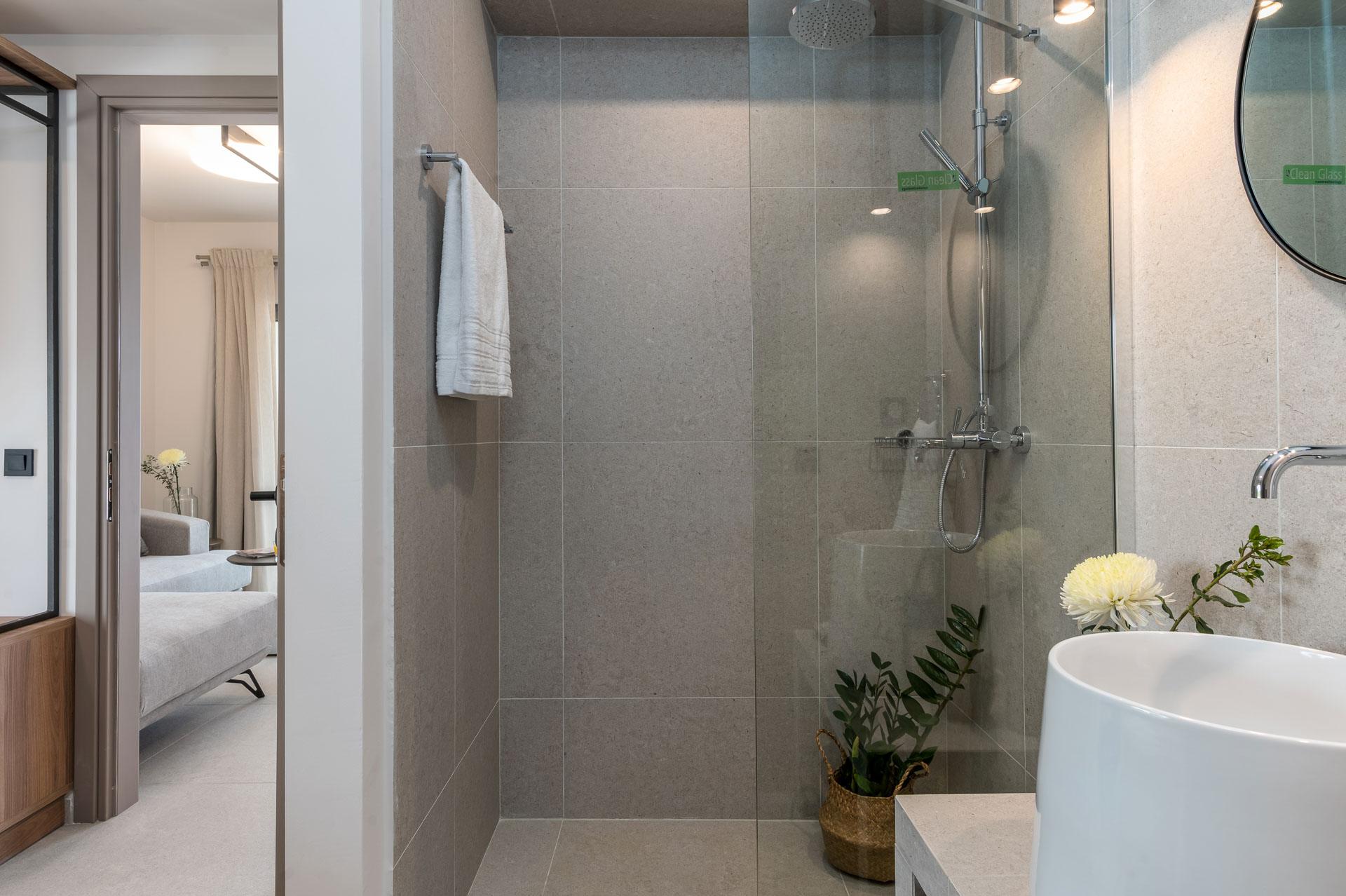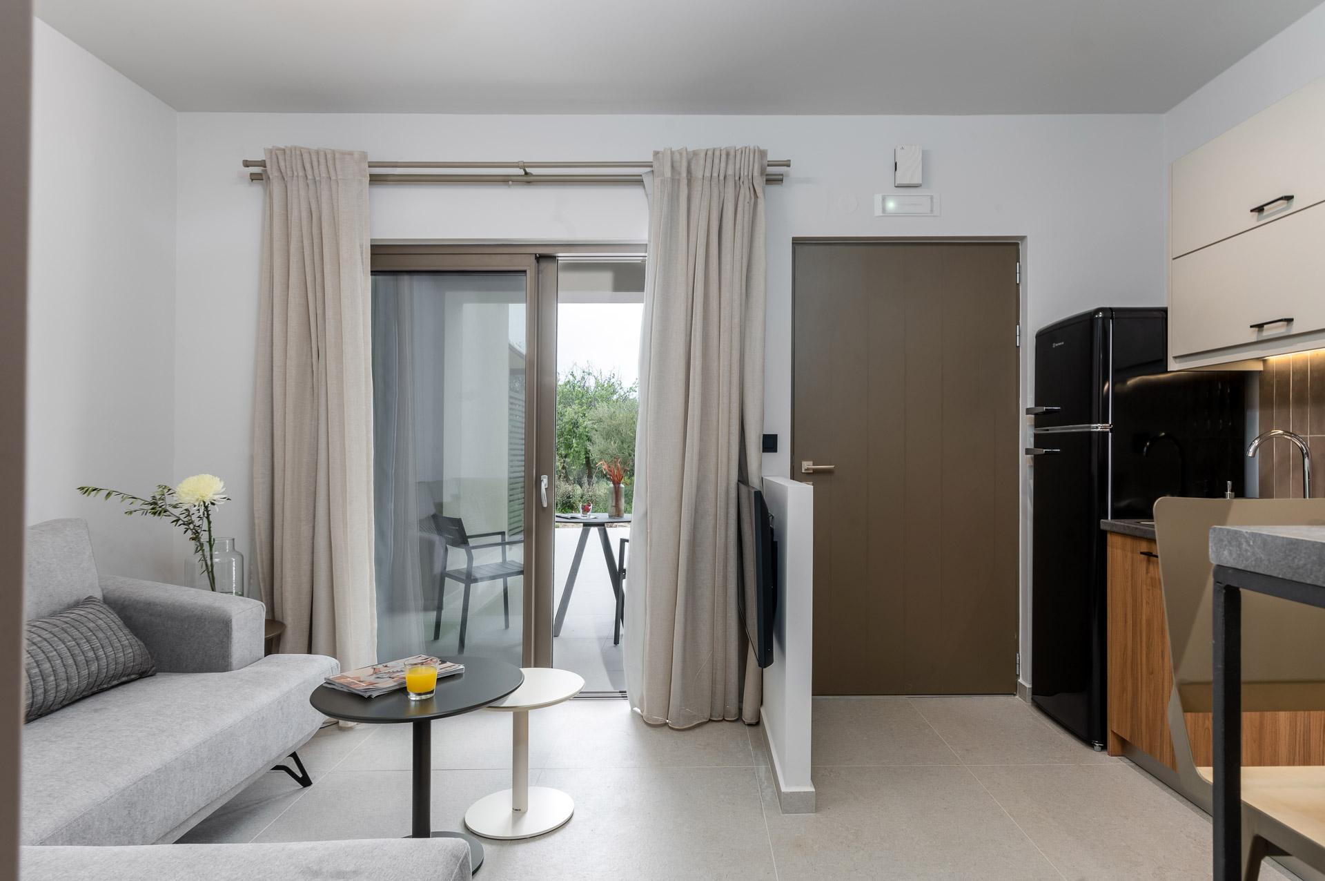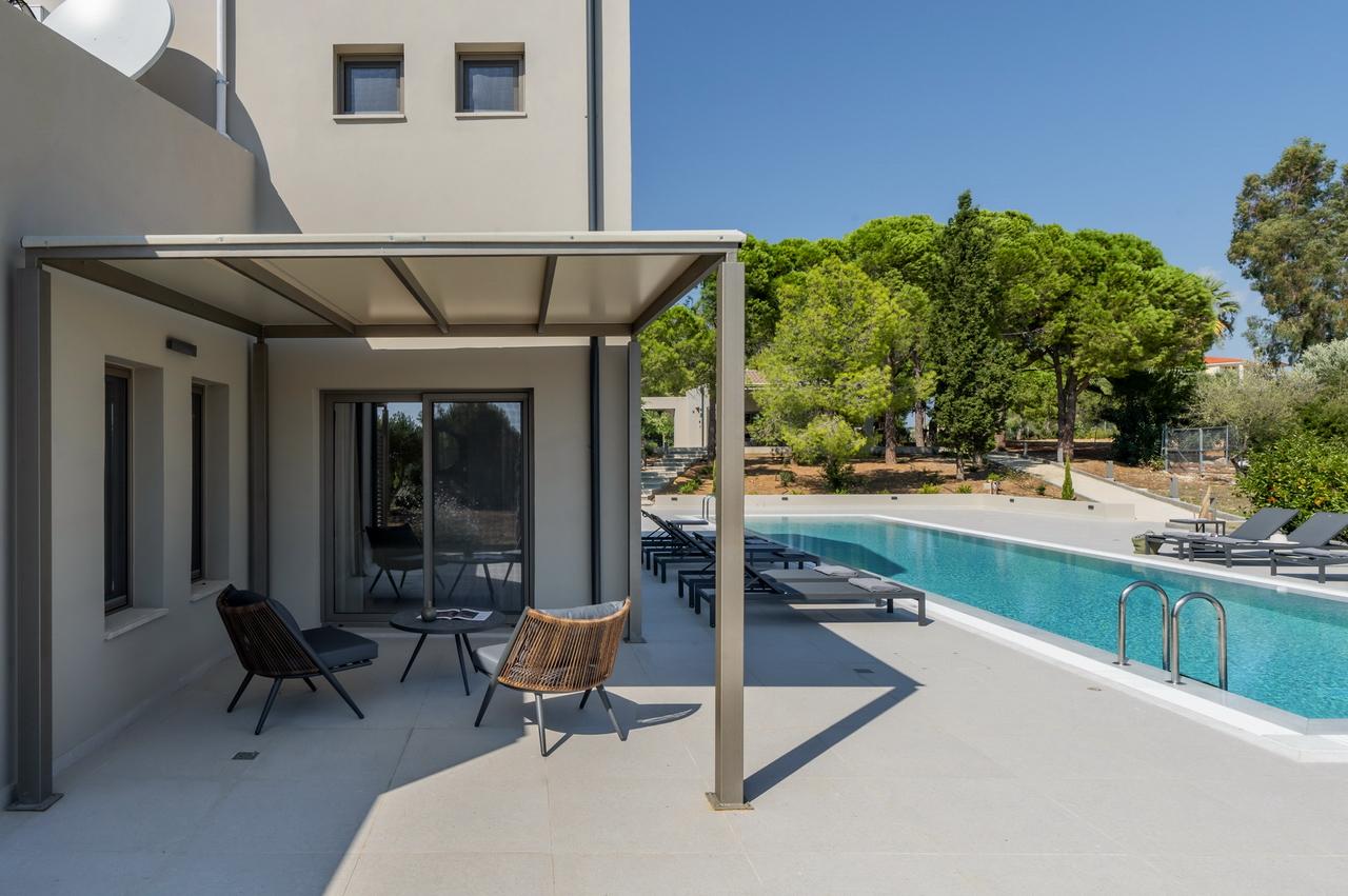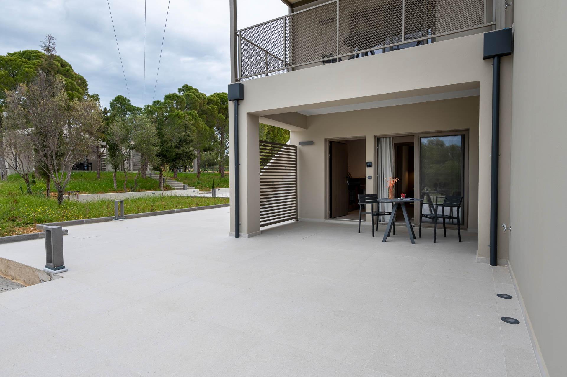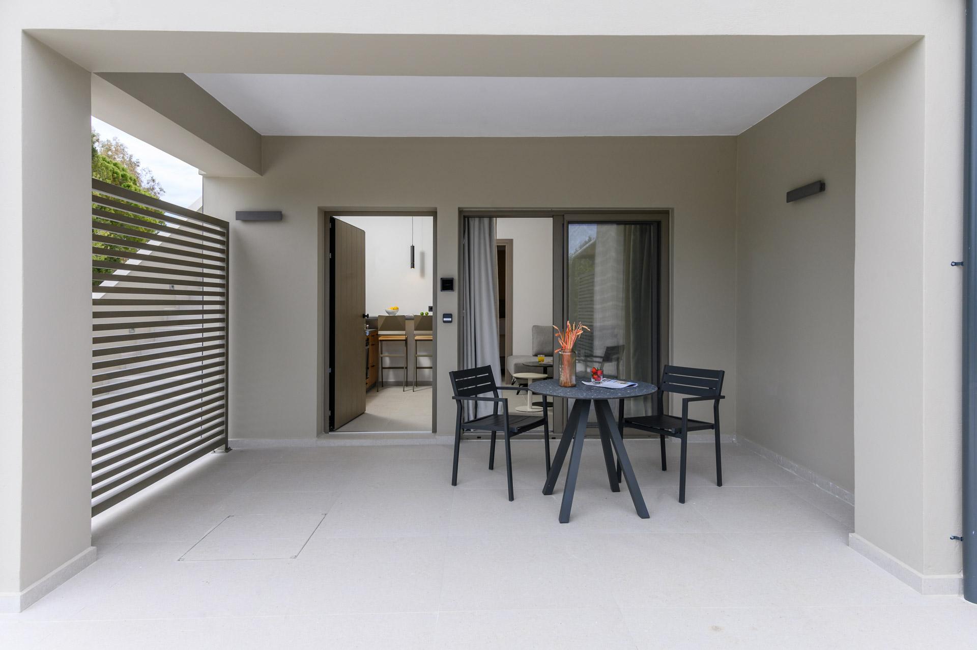 Περπατώντας κάτω από τη σύγχρονη αψίδα για να μπείτε στο συγκρότημα του Ακρωτηρίου, σας εντυπωσιάζει αμέσως η μεγάλη πισίνα που απλώνεται μπροστά σας προς το Ιόνιο Πέλαγος στο βάθος. Ένας φαρδύς διάδρομος χωρίζει τις δύο πρώτες σουίτες εκατέρωθεν σας, καθώς κατεβαίνετε τα σκαλοπάτια με ήπια κλίση προς τη μεγάλη βεράντα και την πισίνα, που περιβάλλεται από άνετες ξαπλώστρες. Στην άλλη άκρη θα βρείτε το τρίτο κτίριο, που στεγάζει τρεις ξεχωριστές σουίτες. Όλο το συγκρότημα περιβάλλεται από ψηλά ώριμα δέντρα, που παρέχουν άφθονη σκιά και παφλασμένη ηλιοφάνεια. Η μεγάλη πισίνα (65 τ.μ.) έχει σύγχρονο ορθογώνιο σχήμα και περιβάλλεται από επίπεδη πλακόστρωτη βεράντα επιπλωμένη με άνετες ξαπλώστρες. Ένα υπαίθριο ντους είναι διαθέσιμο για να ξεπλυθείτε μετά το κολύμπι ή από τις ημέρες στην παραλία!