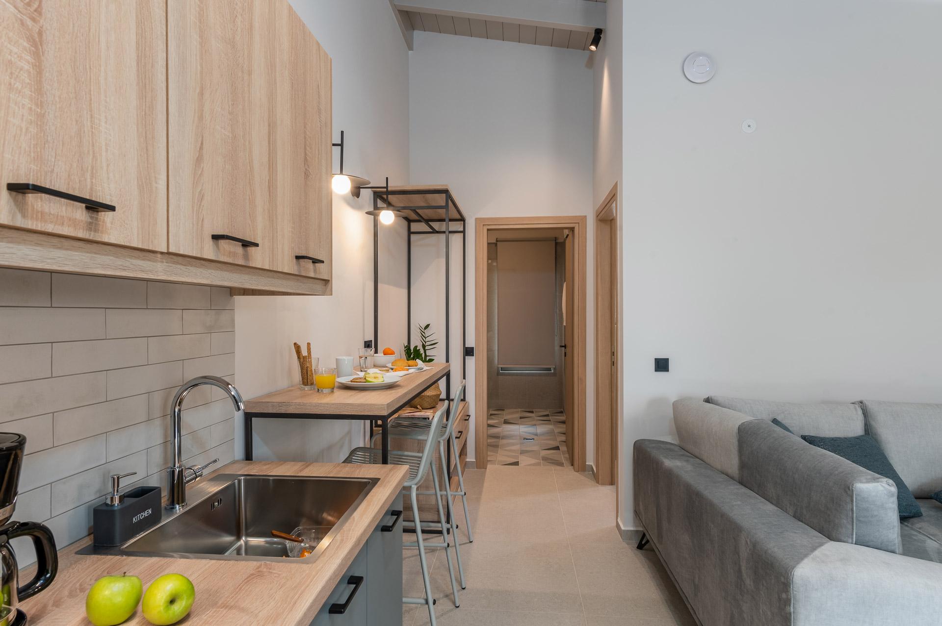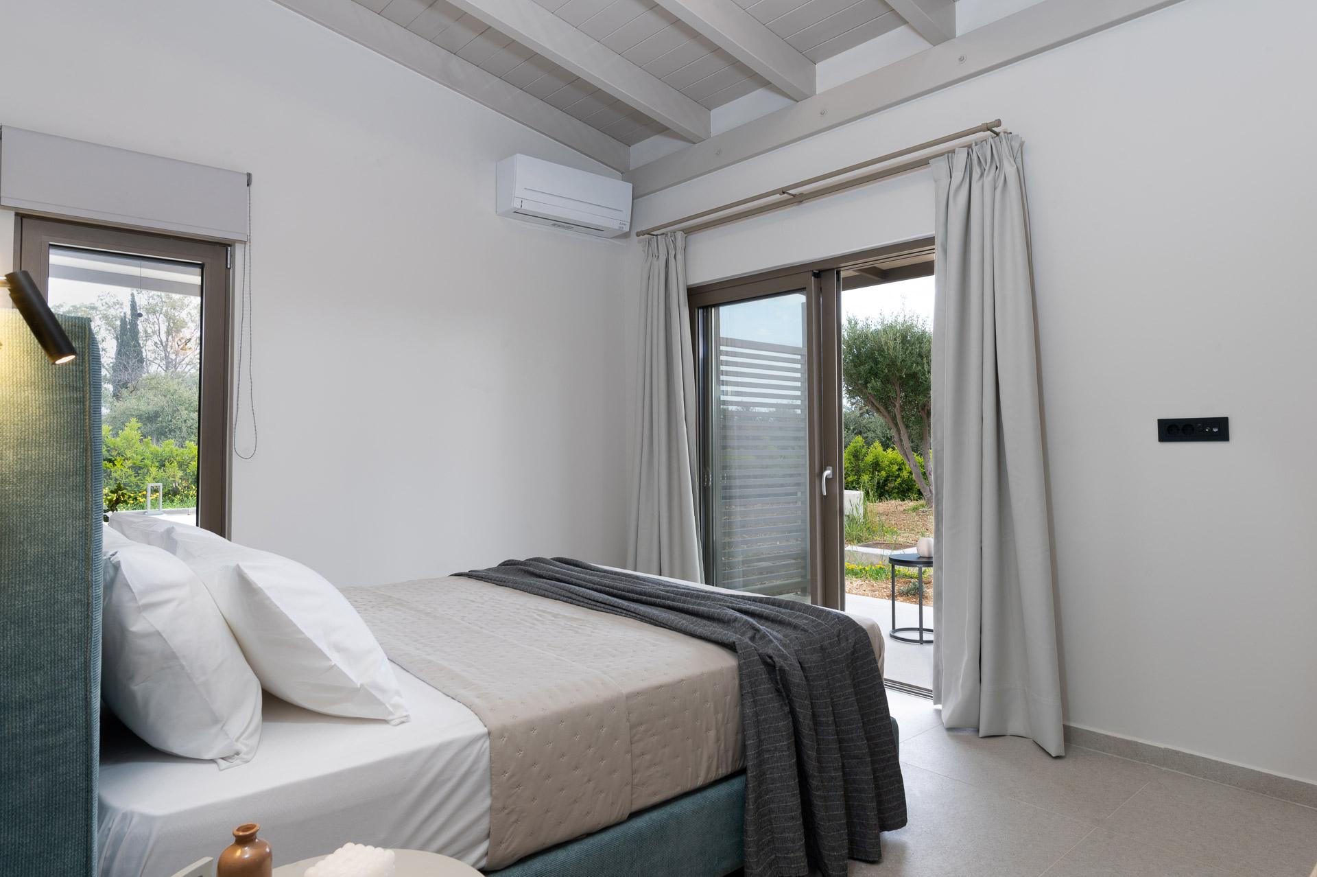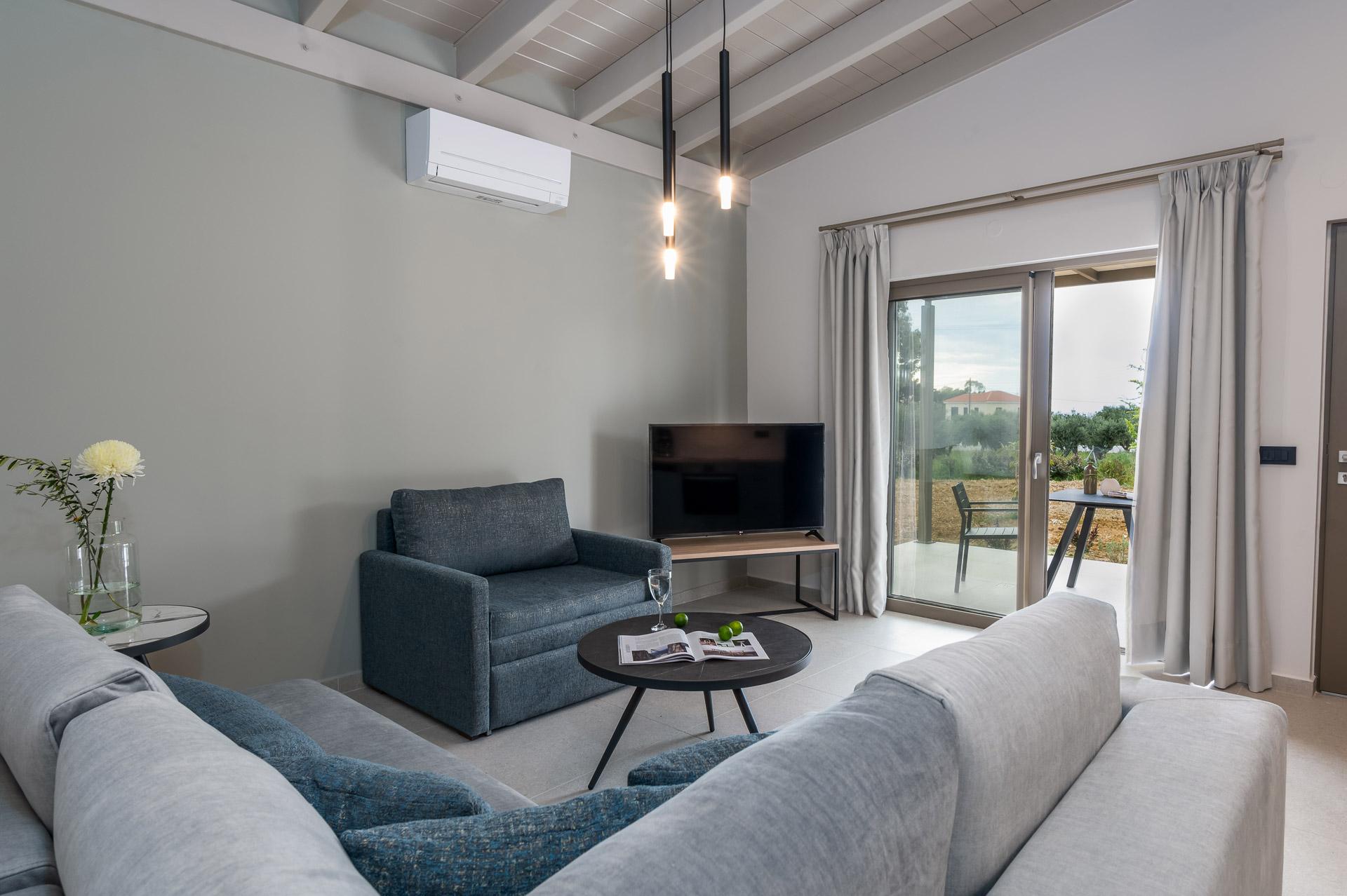 Περπατώντας κάτω από τη σύγχρονη αψίδα για να μπείτε στο συγκρότημα του Ακρωτηρίου, σας εντυπωσιάζει αμέσως η μεγάλη πισίνα που απλώνεται μπροστά σας προς το Ιόνιο Πέλαγος στο βάθος. Ένας φαρδύς διάδρομος χωρίζει τις δύο πρώτες σουίτες εκατέρωθεν σας, καθώς κατεβαίνετε τα σκαλοπάτια με ήπια κλίση προς τη μεγάλη βεράντα και την πισίνα, που περιβάλλεται από άνετες ξαπλώστρες. Στην άλλη άκρη θα βρείτε το τρίτο κτίριο, που στεγάζει τρεις ξεχωριστές σουίτες. Όλο το συγκρότημα περιβάλλεται από ψηλά ώριμα δέντρα, που παρέχουν άφθονη σκιά και παφλασμένη ηλιοφάνεια. Η μεγάλη πισίνα (65 τ.μ.) έχει σύγχρονο ορθογώνιο σχήμα και περιβάλλεται από επίπεδη πλακόστρωτη βεράντα επιπλωμένη με άνετες ξαπλώστρες. Ένα υπαίθριο ντους είναι διαθέσιμο για να ξεπλυθείτε μετά το κολύμπι ή από τις ημέρες στην παραλία!